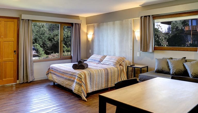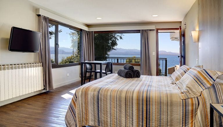 Touristic apartments for 2, 3 or up to 4 guests. Direct or partial view to the Nahuel Huapi Lake, or garden and mountain view. Each one has 30 Sq2, double or twin beds, linen and towels, LED TV, fully equipped kitchen with oven and stove, refrigerator, microwave oven, tableware and bathroom with hairdryer.